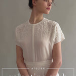 Blouse à manches courtes en crêpe de Chine en soie, dotée d'une patte de boutonnage invisible pour une finition épurée. Le col rond est magnifiquement orné d'un délicat motif floral perlé à la main, apportant une touche d'élégance artisanale. Cette blouse combine parfaitement raffinement et simplicité, idéale pour sublimer vos tenues, que ce soit pour votre cérémonie ou une occasion spéciale.